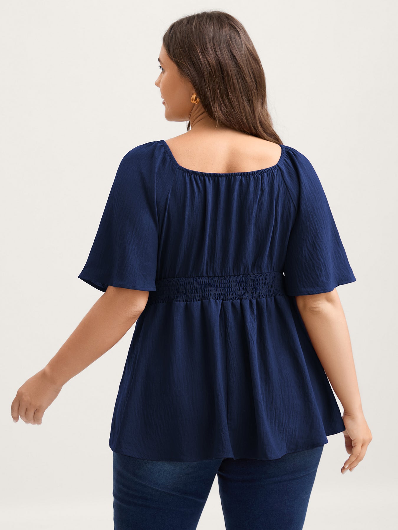 Stretchy Neckline Waist-Cinched Solid Blouse